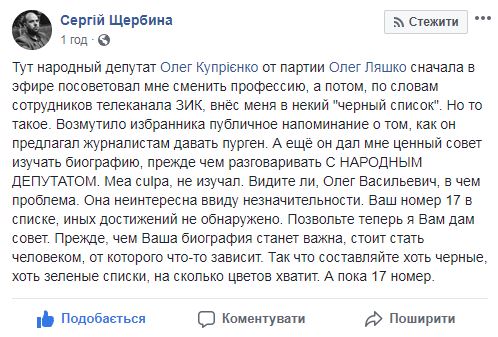 Тут народный депутат Куприенко сначала в эфире посоветовал мне сменить профессию, а потом, по словам сотрудников телеканала ZIK, внес меня в некий "черный список". Но то такое. Возмутило избранника публичное напоминание о том, как он предлагал журналистам давать пурген", - пишет Щербина