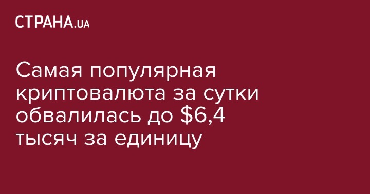 Самая популярная криптовалюта за сутки обвалилась до $6,4 тысяч за единицу