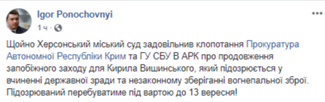 "Только что Херсонский городской суд удовлетворил ходатайство прокуратуры Автономной республики Крым и ГУ СБУ в АРК о продлении меры пресечения для Кирилла Вышинского, который подозревается в совершении государственной измены и незаконном хранении огнестрельного оружия. Подозреваемый будет находится под стражей до 13 сентября", - написал в среду вечером заместитель прокурора АР Крым Игорь Поночовный в своей странице в соцсети Facebook.
