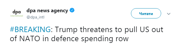"Трамп угрожает вывести США из НАТО на фоне спора о расходах на оборону", - указано в опубликованном сообщении.