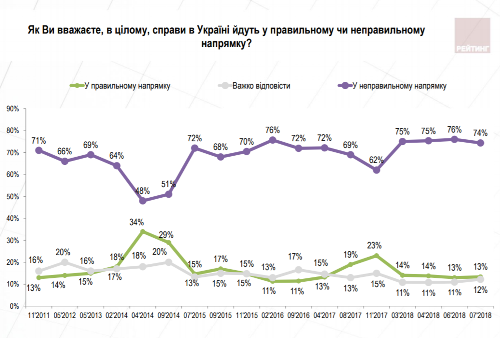 Также социологи спросили украинцев, в каком направлении движется ситуация в стране. 74% людей уверены, что в неправильном - против 13% "оптимистов".