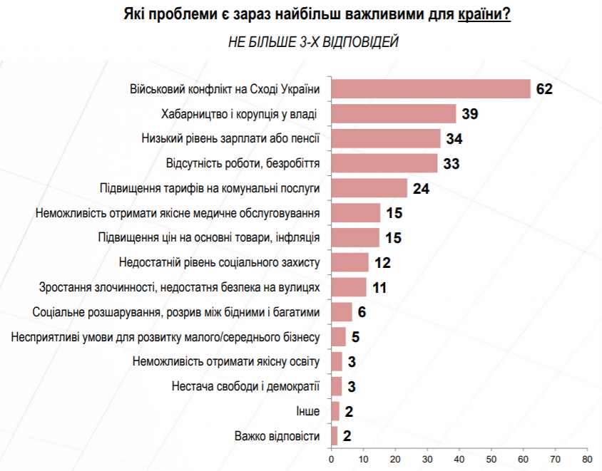 Своими главными проблемами украинцы назвали войну на востоке (64% опрошенных), коррупцию, маленькие зарплаты, безработицу и рост коммунальных тарифов. Также волнует опрошенных рост преступности и некачественное медобслуживание.