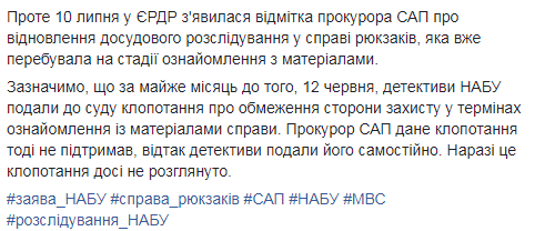 В то же время 10 июля в ЕРДР появилась отметка прокурора САП о возобновлении досудебного расследования по делу, хотя оно уже находилось на стадии ознакомления с материалами.