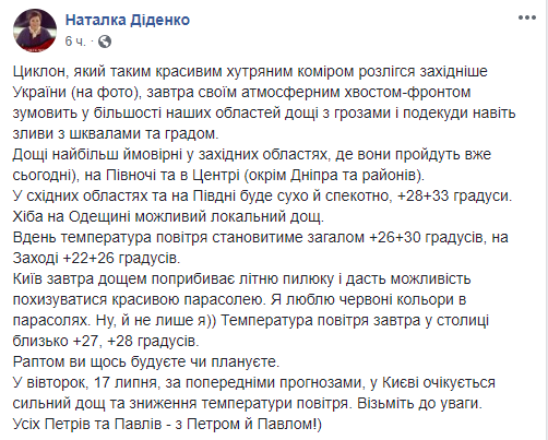 Об этом синоптик Наталка Диденко рассказала на своей странице в Facebook.