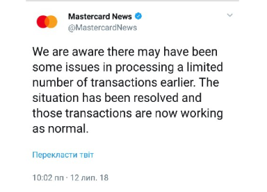 "Сегодня вечером владельцы карт Mastercard могли испытывать трудности в расчетах в Украине и в некоторых европейских странах. Сбой длился около часа по картам всех банков. Сейчас наши коллеги из Mastercard его устранили и все работает стабильно. Приносим свои извинения, если этот сбой вдруг коснулся вас", - написал на своей странице в Facebook пресс-секретарь ПриватБанк в Днепропетровской области Александр Шуть.