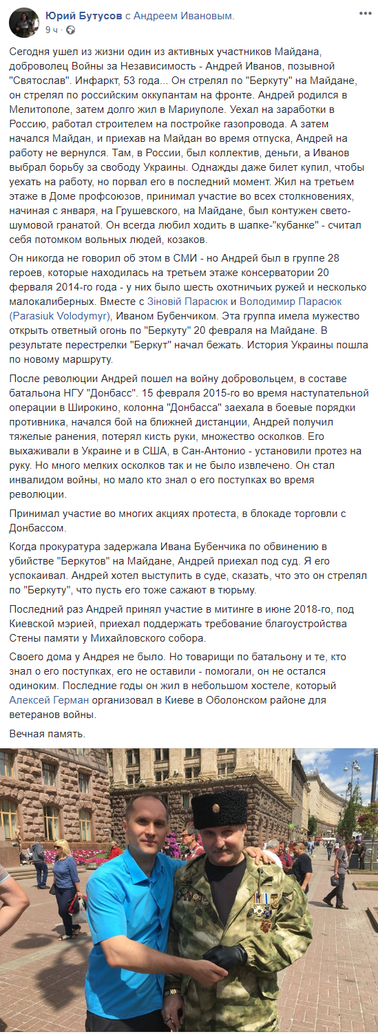 "Инфаркт, 53 года... Он стрелял по "Беркуту" на Майдане, он стрелял по российским оккупантам на фронте", пишет Бутусов.