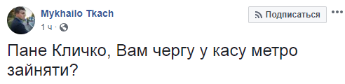 "Пане Кличко, Вам чергу у касу метро зайняти?" - пишет Михаил Ткач.