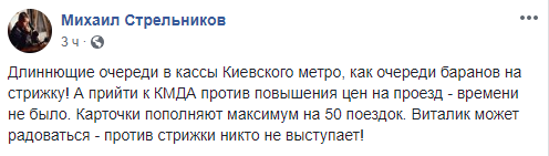 "Длиннющие очереди в кассы Киевского метро, как очереди баранов на стрижку! А прийти к КМДА против повышения цен на проезд - времени не было. Карточки пополняют максимум на 50 поездок. Виталик может радоваться - против стрижки никто не выступает!",  - возмущен Михаил Стрельников.