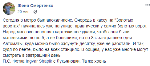 "Сегодня в метро был апокалипсис. Очередь в кассу на "Золотых воротах" начиналась уже на улице, практически у самих Золотых ворот. Народ массово пополнял карточки поездками, чтобы они были маленькими, но по 5, а не большими, но по 8 с завтрашнего дня. Автоматы, куда можно было засунуть десятку, уже не работали. И так, судя по ленте, было на всех станциях. В общем, у нас уже многие могут смотреть в завтрашний день