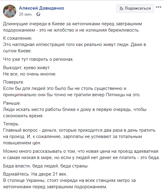 "Длиннющие очереди в Киеве за жетончиками перед завтрашним подорожанием - это не жлобство и не излишняя бережливость. К сожалению. Это наглядная иллюстрация того как реально живут люди. Даже в сытом Киеве. Что уже тут говорить о регионах", заключает предприниматель из Киева Алексей Давиденко.