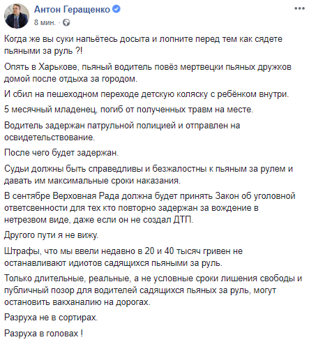 Судьи должны быть справедливы и безжалостны к пьяным за рулем и давать им максимальные сроки наказания", - пишет Геращенко.