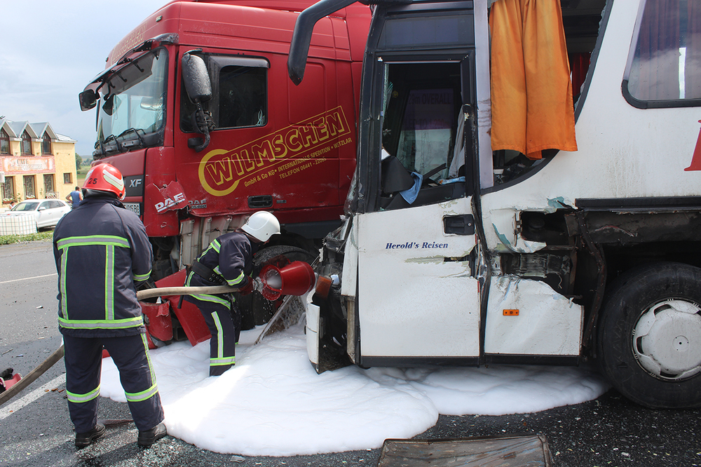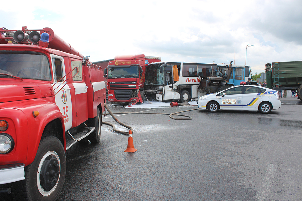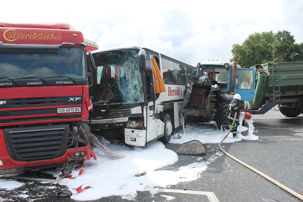 Спасатели сообщили, что на перекрестке Винницкого шоссе и объездной дороги на Черновцы произошло ДТП с участием трактора ХТЗ-200, рейсового автобуса SETRA и грузового автомобиля DAF.