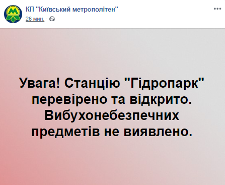 В Киеве 16 июля открыли станцию метро "Гидропарк" после проверки сообщения об угрозе взрыва. Взрывоопасных предметов обнаружено не было. Об этом сообщает пресс-служба киевской подземки в Facebook.