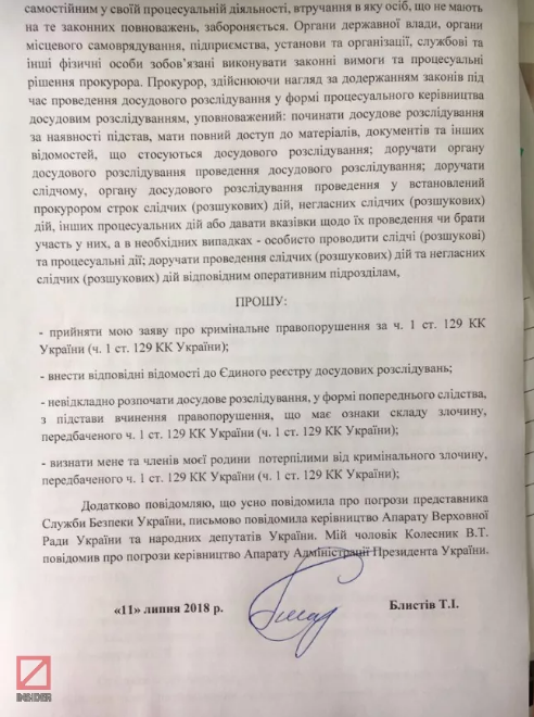 Об этом сообщает "Инсайдер". Соответствующая информация в ЕРДР внесена на основании заявления Блистив в ГПУ.