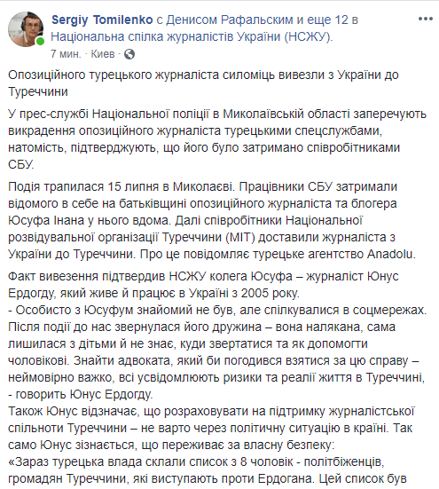 Напомним, происшествие случилось 15 июля в Николаеве. Сотрудники СБУ задержали известного у себя на родине оппозиционного журналиста и блогера Юсуфа Инана у него дома. Далее сотрудники Национальной разведывательной организации Турции (МИТ) доставили журналиста из Украины в Турцию.
