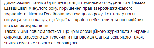 "Для международных партнеров НСЖУ, в частности Международной и Европейской федераций журналистов, принципиальным является соблюдение украинскими властями прав оппозиционных иностранных журналистов, - говорит Сергей Томиленко. - Сейчас мы видим, что действия украинских силовиков есть дикарскими: такими были депортация грузинского журналиста Тамаза Шавшишвили прошлого года, нарушения прав азербайджанского журналиста Фикрата Гусейнова весной этого года. И вот теперь новая ситуация, которая показывает, что Украина - страна опасности для оппозиционных иностранных журналистов.