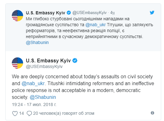 "Мы глубоко обеспокоены сегодняшними нападениями на гражданское общество и НАБУ. Титушки, что запугивают реформаторов, и неэффективная реакция полиции неприемлемы в современном демократическом обществе", - заявили американские дипломаты.