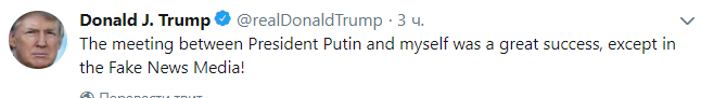 "Встреча между Президентом Путиным и мной была большим успехом везде, кроме фейк-ньюс медиа!", - заявил он.