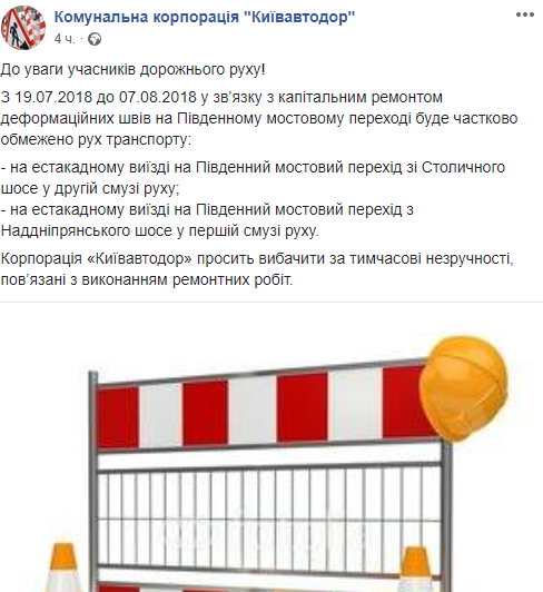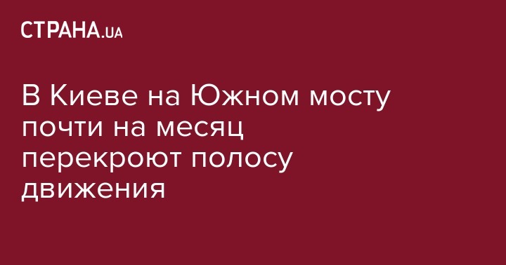 В Киеве с 19 июля по 7 августа ограничат движение транспорта по Южному мосту в связи с капитальным ремонтом деформационных швов. Об этом сообщает пресс-служба "Киевавтодора" в соцсети Facebook.