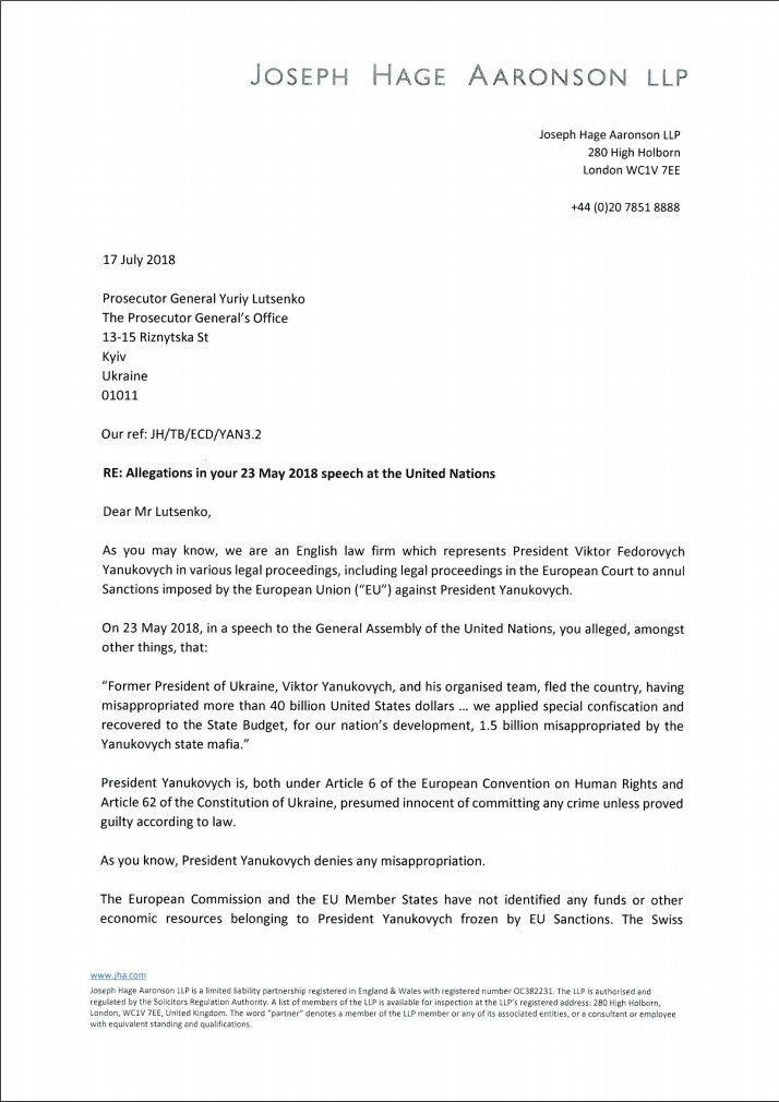 Британская юридическая фирма Joseph Hаge Aaronson LLP (JHA LLP), представляющая интересы бывшего президента Виктора Януковича на Западе, обратилась к генеральному прокурору Украины Юрию Луценко с официальным письмом.