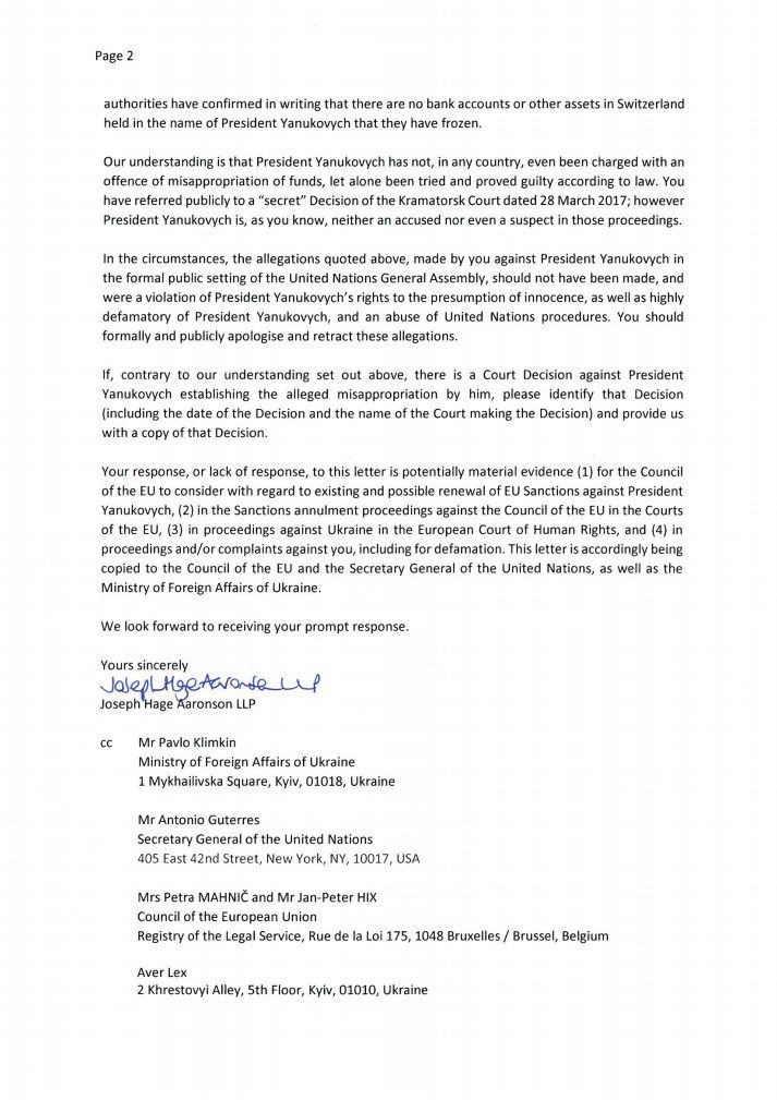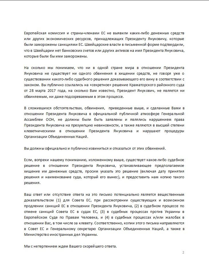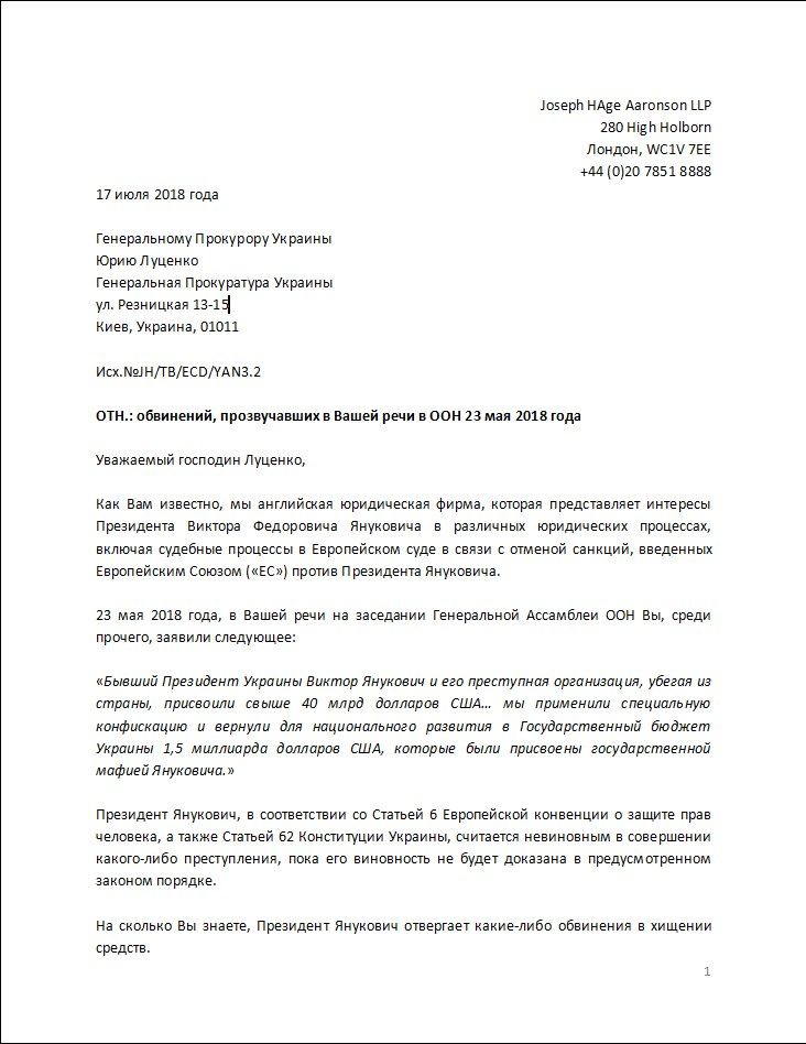 В нем они требуют официально и публично извиниться за высказывания в адрес бывшего Януковича, которые глава ГПУ озвучил 23 мая 2018 года на заседании ООН. Тогда Луценко сообщил о якобы причастности экс-главы Украины и его окружения к хищению 40 млрд долларов и о спецконфискации 1,5 млрд долларов по решению Краматорского районного суда.