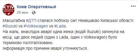 "К сожалению, в результате аварии одна женщина (водитель Suzuki) погибла на месте, еще два человека (один из Lada, один из Volkswagen) был срочно госпитализирован. Информация о причинах аварии уточняется," - говориться в сообщении.