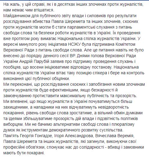 "Память Георгия Гонгадзе, Игоря Александрова, Вячеслава Веремия, Павла Шеремета и других журналистов, которые погибли, выполняя свои профессиональные обязанности, побуждает нас к солидарности - убийцы и заказчики должны быть наказаны", - отмечает НСЖУ.