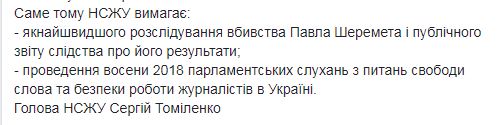 "НСЖУ требует скорейшего расследования убийства Павла Шеремета и публичного отчета следствия о его результатах и проведение осенью 2018 парламентских слушаний по вопросам свободы слова и безопасности работы журналистов в Украине", - отмечается в сообщении.