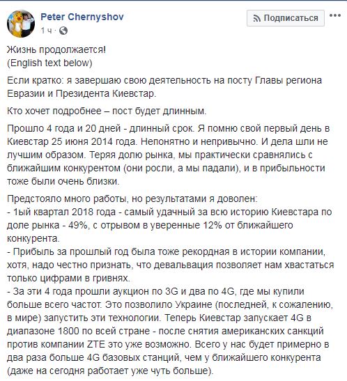 "Что будет дальше? Я спокоен за "Киевстар": еще будет много интересных проектов запущено и объявлено в 2018 году и, особенно, в 2019 - но о них теперь пусть говорит новый СЕО. Я передаю ему растущую компанию в очень хорошем состоянии, и уверен, что "Киевстар" продолжит уверенное движение вперед к новым рекордам, по заветам Джима Коллинза в книге "От хорошего к великому", как это было и с "Карлсберг Украина" после нашего расставания", - подчеркнул Чернышов.