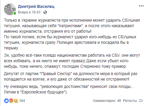 "По такой логике, если бы журналист ударил кого-нибудь из СБУшных титушек, журналиста сразу Полиция арестовала и посадила бы в тюрьму. Эх, удобно всё-таки псевдо националистам работать на СБУ, они могут всех избивать, а их никто не имеет права)) Даже если убьют кого-нибудь, тоже ничего, отмажут, господин Стерненко тому пример", считает Василец.