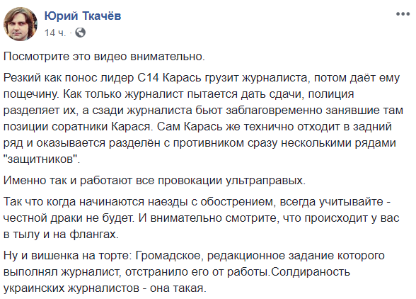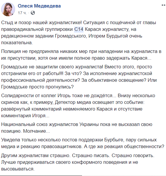 "Стыд и позор нашей журналистике! Ситуация с пощёчиной от главы праворадикальной группировки С14 Карася журналисту, на редакционном задании Громадського, Игорем Бурдыгой очень показательна.