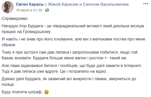 При этом сам Карась после инцидента со смехом заявил, что если Бурдыга обратится с заявлением в полицию, то он уплатит штраф: