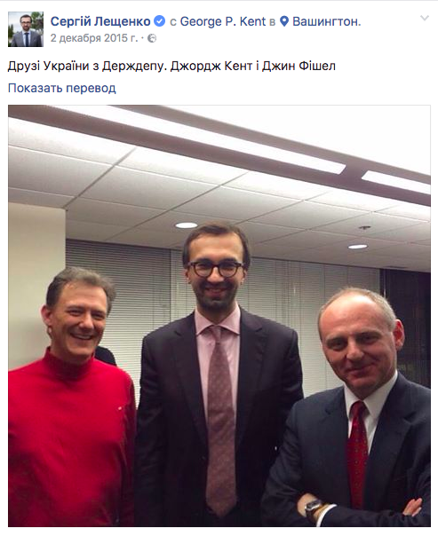 "Очень хочется поздравить Джорджа Кента с повышением – он теперь в Госдепе будет отвечать за 7 стран Восточной Европы и Кавказа. В том числе за Украину. Жаль прощаться с ним и его очаровательной женой Велид. На память подарили ему напечатанный в Голосе Украины закон об антикоррупционном суде", – написала у себя на ФБ депутат Светлана Залищук.