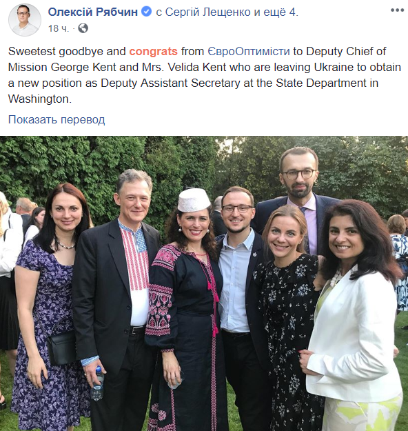 Самое горячее "прощай" и поздравления от "Еврооптимистов" заместителю начальника Миссии Джорджу Кенту и г-же Велиде Кент, которые уезжают из Украины, чтобы получить новую должность заместителя помощника госсекретаря в Государственном департаменте в Вашингтоне", - написал Рябчин.