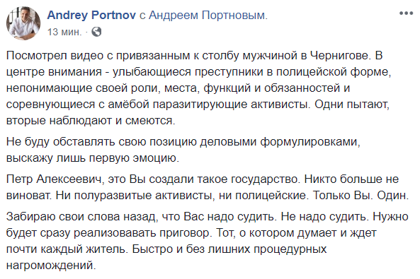 "Посмотрел видео с привязанным к столбу мужчиной в Чернигове. В центре внимания - улыбающиеся преступники в полицейской форме, непонимающие своей роли, места, функций и обязанностей и соревнующиеся с амёбой паразитирующие активисты. Одни пытают, вторые наблюдают и смеются.