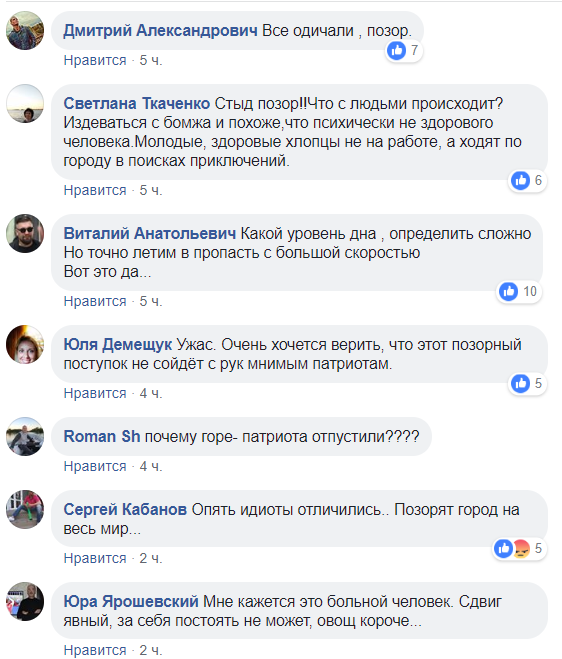"Все одичали. Позор". "Ужас. Очень хочется верить, что этот позорный поступок не сойдёт с рук мнимым патриотам". "Что с людьми происходит? Издеваются с бомжа и похоже, что психически не здорового человека. Молодые, здоровые хлопцы не на работе, а ходят по городу в поисках приключений".