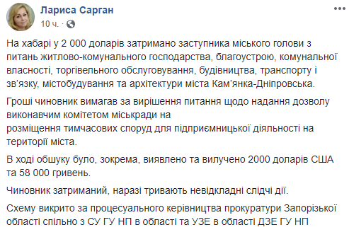 "На взятке в 2 тысяч долларов задержан заместитель городского головы по вопросам жилищно-коммунального хозяйства, благоустройства, коммунальной собственности, торгового обслуживания, строительства, транспорта и связи, градостроительства и архитектуры города Каменка-Днепровская. Деньги чиновник требовал за решение вопроса о предоставлении разрешения исполнительным комитетом горсовета на размещения временных сооружений для предпринимательской деятельности на территории города", – сообщила Сарган.