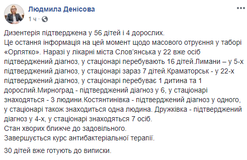 Стало известно о состоянии здоровья детей, которые отравились в лагере "Орленок"на Донбассе. Об этом в Facebook сообщила Уполномоченный Верховной Рады Украины по правам человека Людмила Денисова.