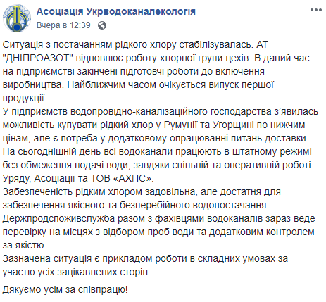 В ассоциации "Укрводоканалэкология" сообщили, что ситуация с поставками жидкого хлора на водоканалы стабилизировалась после того, как "Днепразот" возобновил работу хлорных цехов. Об этом сообщает ассоциация "Укрводоканалэкология" на своей странице в соцсети Facebook.