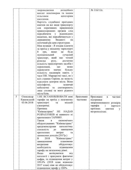 В частности, было учтено предложение советника начальника КП "Киевский метрополитен" Натальи Макогон, которая предложила, чтобы часть средств от повышения стоимости проезда пошла на повышение заработной платы людям рабочих профессий, а также внедрить программу экономии электроэнергии. Еще один житель столицы Дмитрий Лещев также полностью поддержал подорожание билета за проезд в общественном транспорте, но отметил, что нужно сделать более лояльной систему многоразовых проездных. Например, ввести проездной на день, несколько дней, неделю,