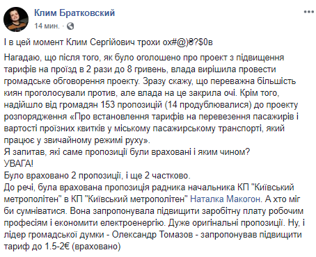 Также Клим Братковский напомнил в своем посте, что подавляющее число киевлян в процессе общественного обсуждения проекта повышения стоимости проезда в столичном общественном транспорте проголососвали против этой инициативы.