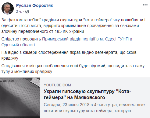 Как сообщил в Facebook советник главы полиции Одесской области Руслан Форостяк, по факту кражи скульптуры открыто уголовное производство.