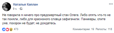 "Не говорила я ничего про предсмертный стан Олега. Либо опять что-то не так поняли, либо для красноного словца зафигачили. Паникеры, спите уже, похорон не будет, не дождетесь", - написала она.