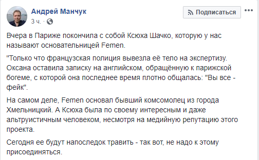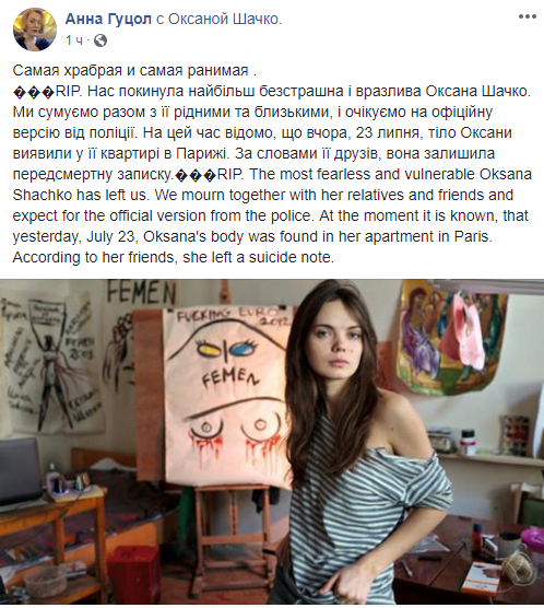 Лидер Femen Анна Гуцол в Facebook написала, что "нас покинула самая бесстрашная и самая ранимая" и что родные и друзья ждут официальных выводов полиции.