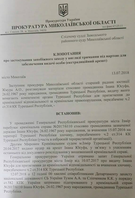 12 июня Государственная миграционная служба отменила Юсуфу Инана разрешение на иммиграцию на основании статьи закона об иммиграции в отношении действий, "которые представляют угрозу национальной безопасности и общественному порядку в Украине". Прокуратура Николаевской области не увидела оснований, по которым нельзя экстрадировать Юсуфа Инана. Заместитель прокурора Анатолий Жмура в своем ходатайстве настаивал, что из-за этого Юсуфа Инана нужно изолировать от граждан Украины, применив экстрадиционный арест.