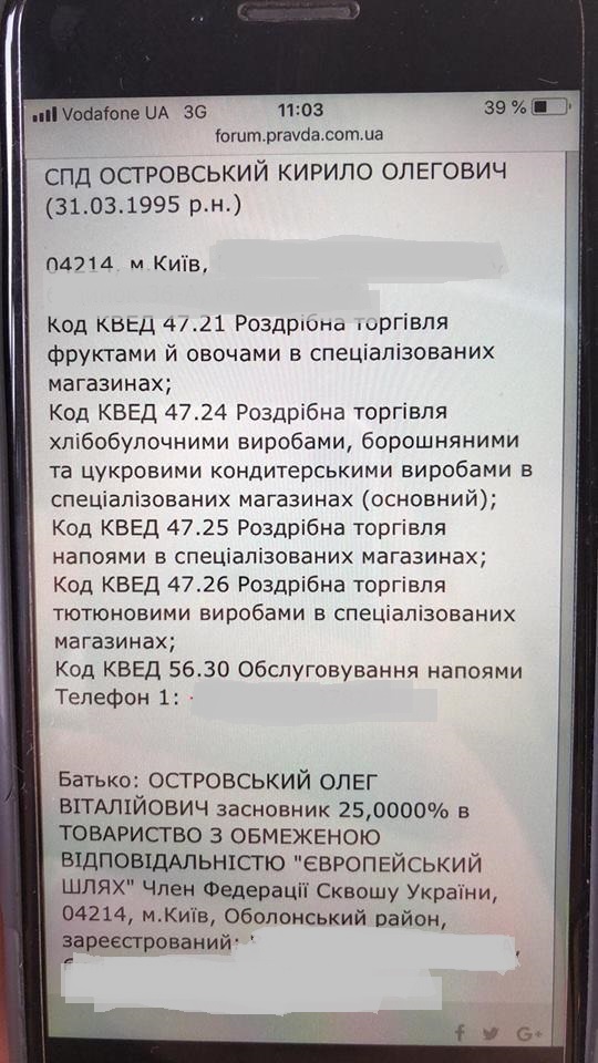 Как выяснила "Страна", отец виновника ДТП, Островский Олег Витальевич является учредителем и владельцем 25% ООО "Европейский путь". Также он является членом Федерации сквоша Украины. Отец зарегистрирован по тому же адресу в Киеве, что и сын.