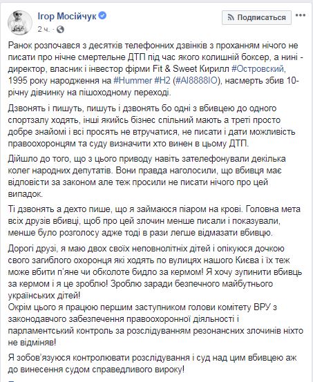 "Звонят и пишут, пишут и звонят, потому что одни с убийцей в один спортзал ходят, другие какой-то бизнес совместный имеют, третьи просто хорошо знакомы и все просят не вмешиваться, не писать и дать возможность правоохранителям и суду определить кто виноват в этом ДТП. Дошло до того, что по этому поводу даже позвонили несколько коллег народных депутатов. Они, правда, подчеркнули, что убийца должен ответить по закону, но тоже просили не писать ничего об этом случае", – сообщил Мосийчук.