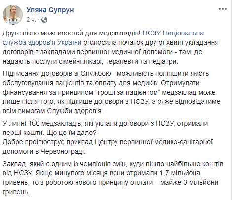 Глава Минздрава Ульяна Супрун также сообщила, что в июле 160 медучреждений, которые составили договор с НСЗУ, получили первые деньги от государства. Лидером среди больниц, куда ушло больше всего средств, стал Центр первичной медико-санитарной помощи в Червонограде львовской области (в июне получено 1,7 миллионов гривен).