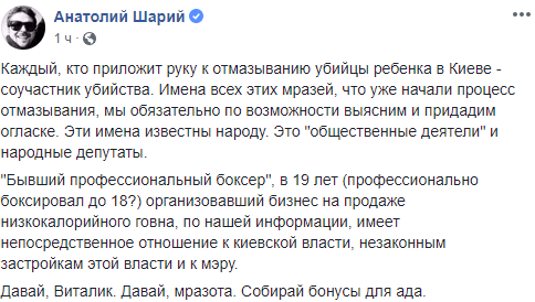 ""Бывший профессиональный боксер", в 19 лет (профессионально боксировал до 18?) организовавший бизнес на продаже низкокалорийного г...вна, по нашей информации, имеет непосредственное отношение к киевской власти, незаконным застройкам этой власти и к мэру", - заявил Шарий.