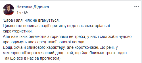 "Сегодня дождливо будет в западных областях и на севере Украины. Локальные дожди могут бродить практически по всех наших областях,- написала она. - Дожди, хотя и ливневого характера, но кратковременные. Кстати, в метеорологии кратковременный дождь - идущий около трех часов. Так что все у нас по прогнозу".